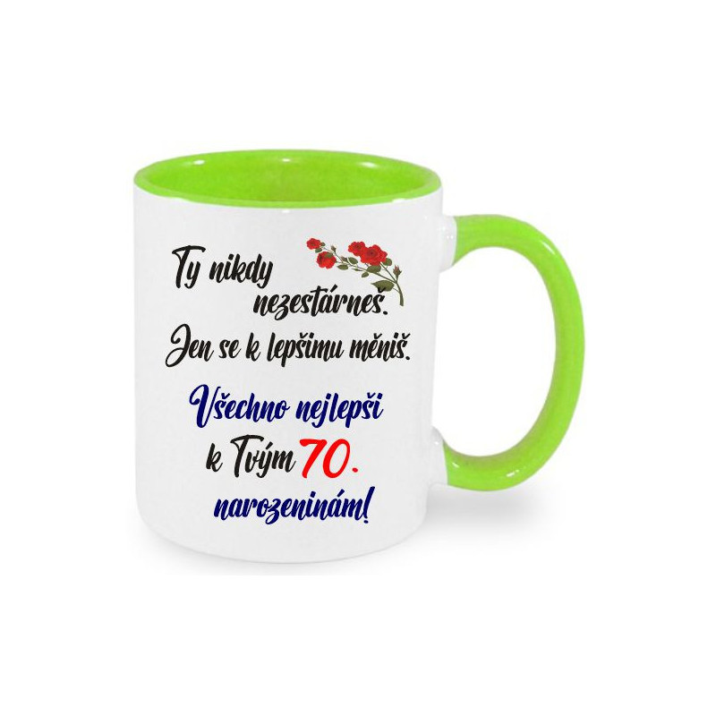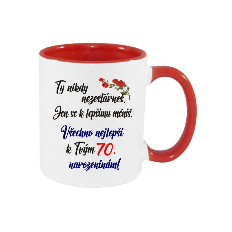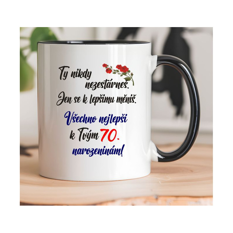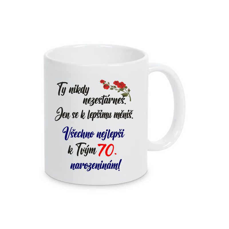 • Osobní přístup - Hrnek obsahuje speciální přání "Všechno nejlepší k 70. narozeninám", které oslavenci připomene váš blízký vztah • Humorný nádech - Vtipný nápis "Ty nikdy nezestárneš" vykouzlí úsměv na tváři a odlehčí atmosféru oslavy • Každodenní použití - Praktický dárek, který bude oslavenci připomínat vaše přání při každém doušku kávy či čaje