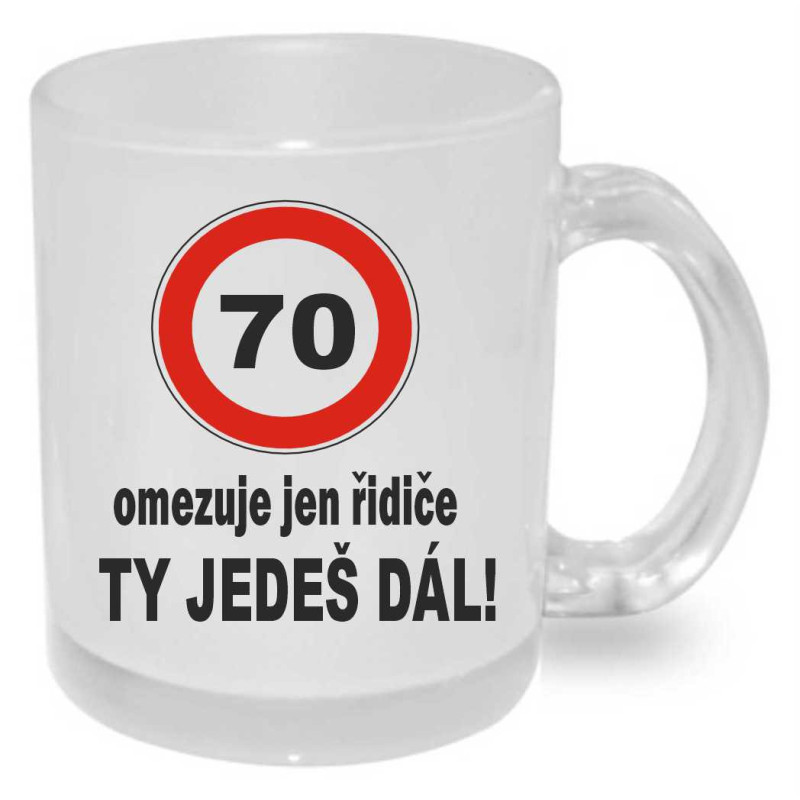 Originální narozeninový hrnek s dopravní značkou a textem: "70 omezuje jen řidiče. Ty jedeš dál." Praktický a užitečný dárek k 70. narozeninám pro muže i ženu.