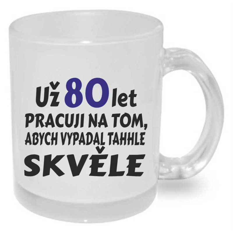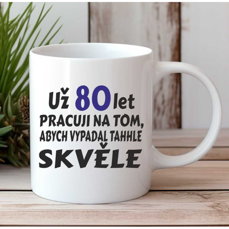 Keramický hrnek poslouží jako dárek pro muže k 80. narozeninám. Potisk je z obou stran s nápisy: "Už 80 let pracuji na tom, abych vypadal takhle skvělě." a da druhé straně "Hodně štěstí, zdraví a oslavy bez obavy, že Ti bude o rok víc, nedělej si z toho nic".