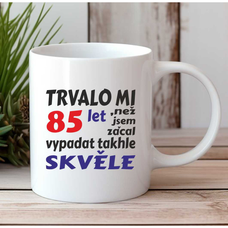 Tento originální hrnek s potiskem je skvělým způsobem, jak oslavit 85. narozeniny. Potisk s vtipným nápisem "Trvalo mi 85 let než jsem začal vypadat takhle skvěle" zaručeně potěší každého muže, který oslavuje tuto významnou událost.