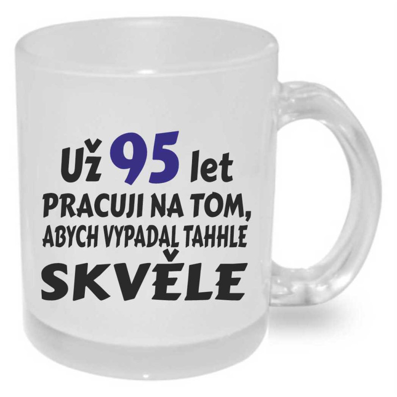 Keramický hrnek poslouží jako dárek pro muže k 95. narozeninám. Potisk je z obou stran s nápisy: "Už 95 let pracuji na tom, abych vypadal takhle skvělě." a da druhé straně "Hodně štěstí, zdraví a oslavy bez obavy, že Ti bude o rok víc, nedělej si z toho nic".