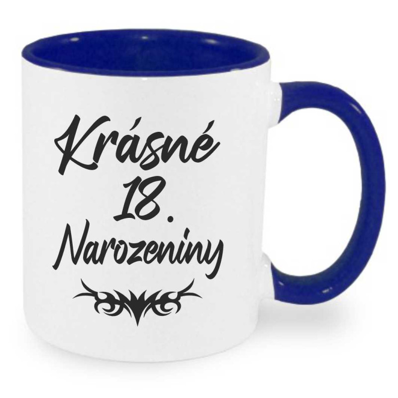 Keramický hrnek poslouží jako dárek pro muže i ženu k 18 narozeninám. Potisk je z obou stran s nápisy: "Krásné 18 narozeniny" a da druhé straně "Hodně štěstí, zdraví a oslavy bez obavy, že Ti bude o rok víc, nedělej si z toho nic".