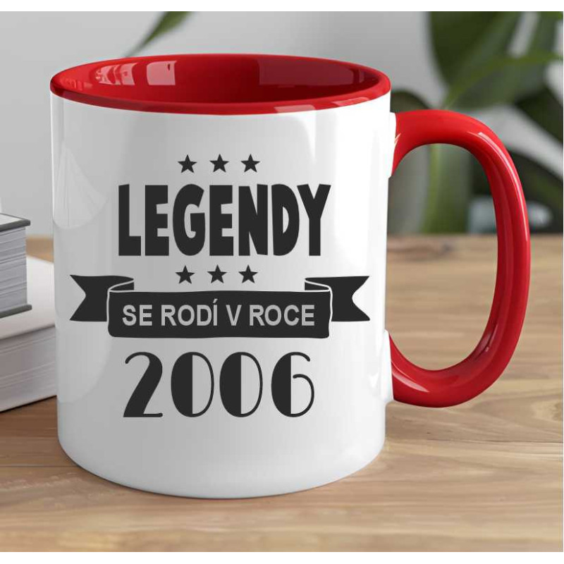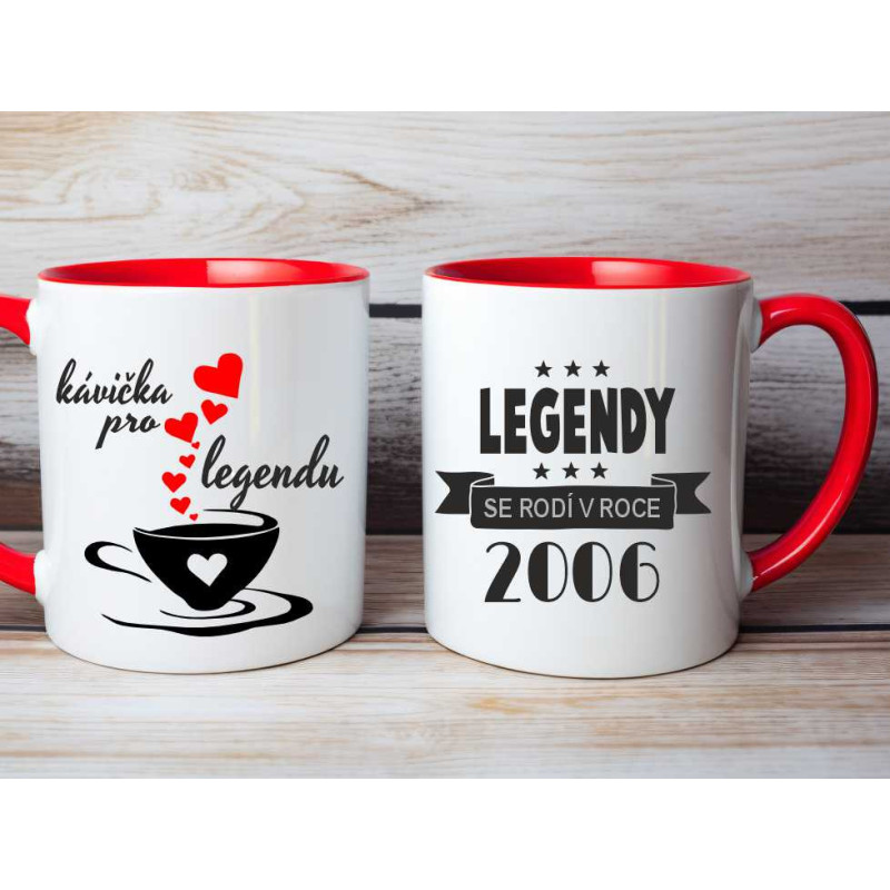 Hrnek k 19. narozeninám s potiskem přední strana: "Legendy se rodí v roce 2006" a zadní strana: "Kávička pro legendu". Udělejte radost k 19. narozeninám hrníčkem, který je skvělým praktickým dárkem.