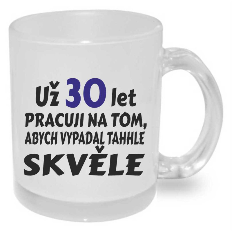 Keramický hrnek poslouží jako dárek pro muže k 30. narozeninám. Potisk je z obou stran s nápisy: "Už 30 let pracuji na tom, abych vypadal takhle skvělě." a da druhé straně "Hodně štěstí, zdraví a oslavy bez obavy, že Ti bude o rok víc, nedělej si z toho nic".