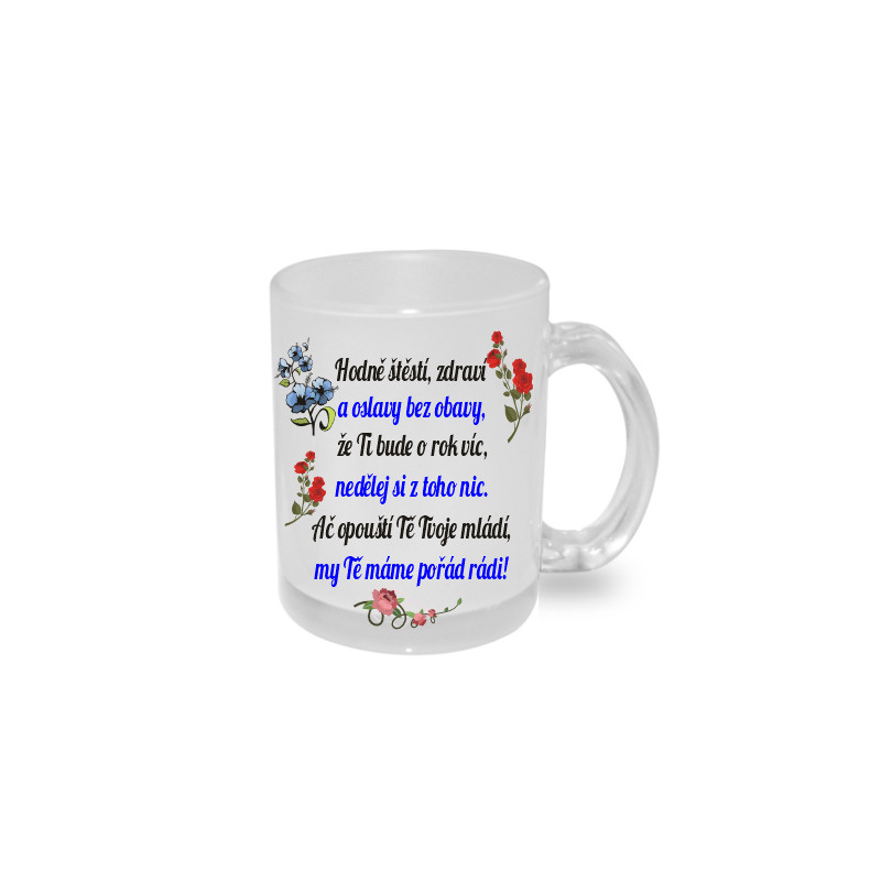 Hrnek s potiskem přáním k narozeninám - Hodně štěstí, zdraví a oslavy bez obavy, že Ti bude o rok víc, nedělej si z toho nic. Ač opouští Tě Tvoje mládí, my Tě máme pořád rádi.