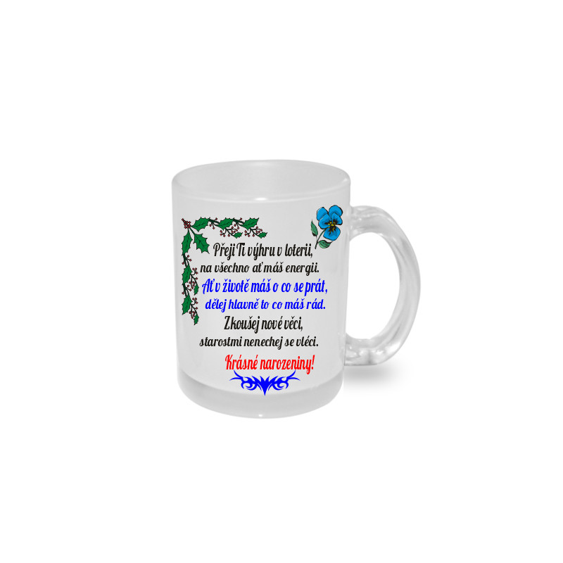Hrnek s potiskem přáním k narozeninám - Přeji Ti výhru v loterii, na všechno ať máš energii. Ať v životě máš o co se prát, dělej hlavně to co máš rád. Zkoušej nové věci, starostmi nenechej se vléci. Krásné narozeniny!