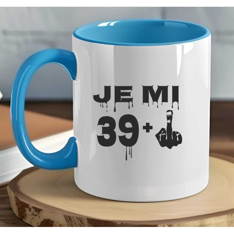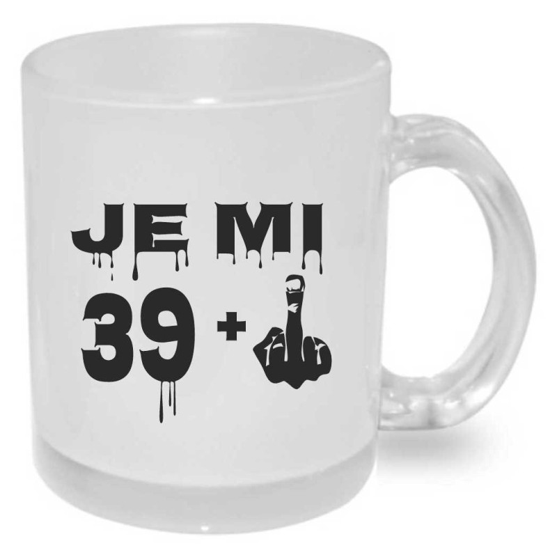 Perfektní bílý keramický hrnek k 40. narozeninám s vtipným potiskem "Je mi 39 plus prostředníček". Originánální dárek na 40. narozeniny pro ženu či muže.