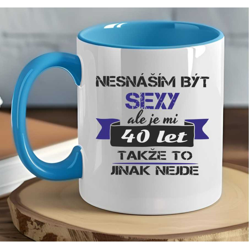 Keramický hrnek v barvě bílé, barevné nebo matném skle s vtipným potiskem: Nesnáším být sexy, ale je mi 40 let takže to jinak nejde.