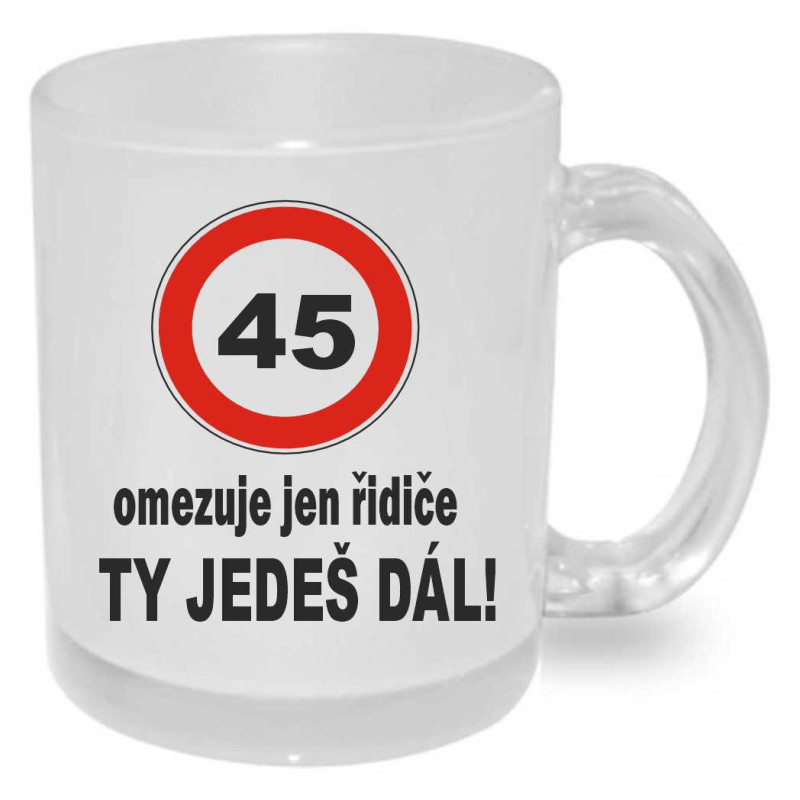 Originální narozeninový hrnek s dopravní značkou a textem: "45 omezuje jen řidiče. Ty jedeš dál." Praktický a užitečný dárek k 45. narozeninám pro muže i ženu.