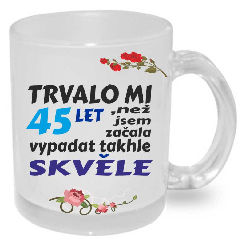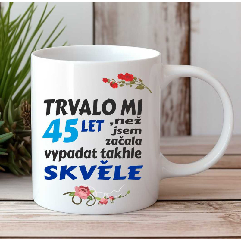 Hrníček s potiskem vtipného textu, který je ideální k 45 narozeninám jako dárek.