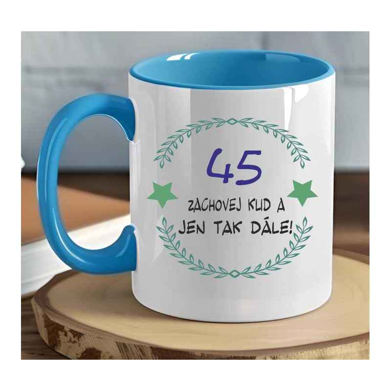 Hrníček s potiskem "45 zachovej klid a jen tak dále" je skvělý dárek k 45. narozeninám pro ženu. Udělejte radost tímto krásným hrníčkem oslavenkyni 45. narozenin. Hrníček bude památkou na oslavu a také na Vás, jelikož pěkné věci si člověk dlouho pamatuje.