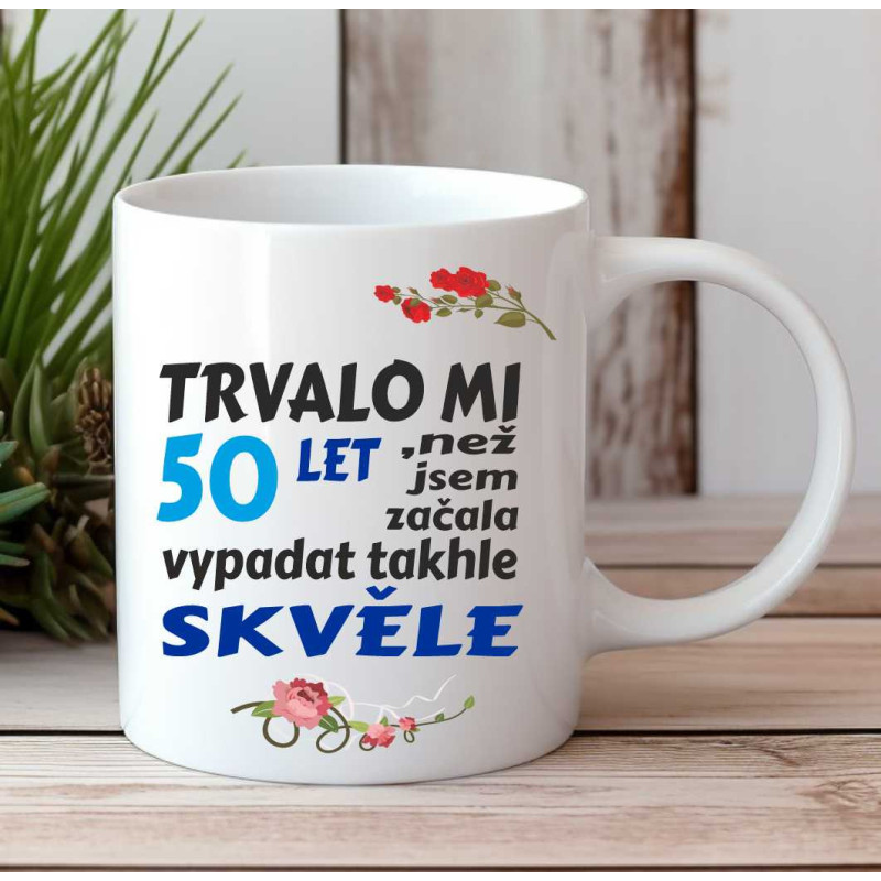 Hledáte originální dárek k 50. narozeninám pro výjimečnou ženu ve vašem životě? Něco, co ji každé ráno vykouzlí úsměv na tváři a připomene, jak nádherně s věkem rozkvétá? Náš hrnek s vtipným nápisem "Trvalo mi 50 let než jsem začala vypadat takhle skvěle" je přesně to, co hledáte!