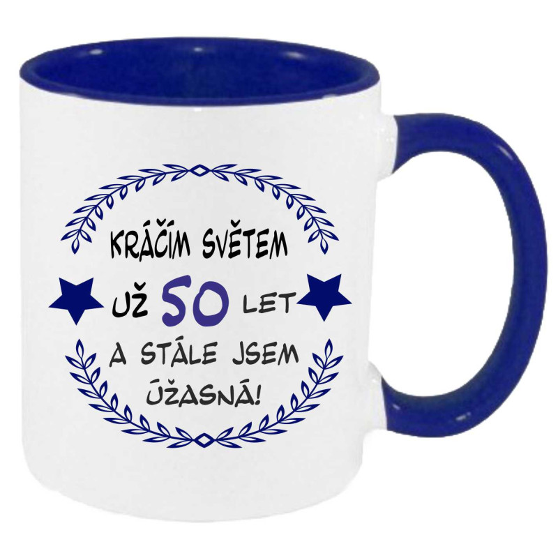 Hrníček s potiskem "Kráčím světem už 50 let a stále jsem úžasná" je ideální dárek k 50. narozeninám pro ženu. Udělejte radost tímto krásným hrníčkem oslavenkyni 50 narozenin. Hrníček bude památkou na oslavu a také na Vás, jelikož pěkné věci si člověk dlouho pamatuje.