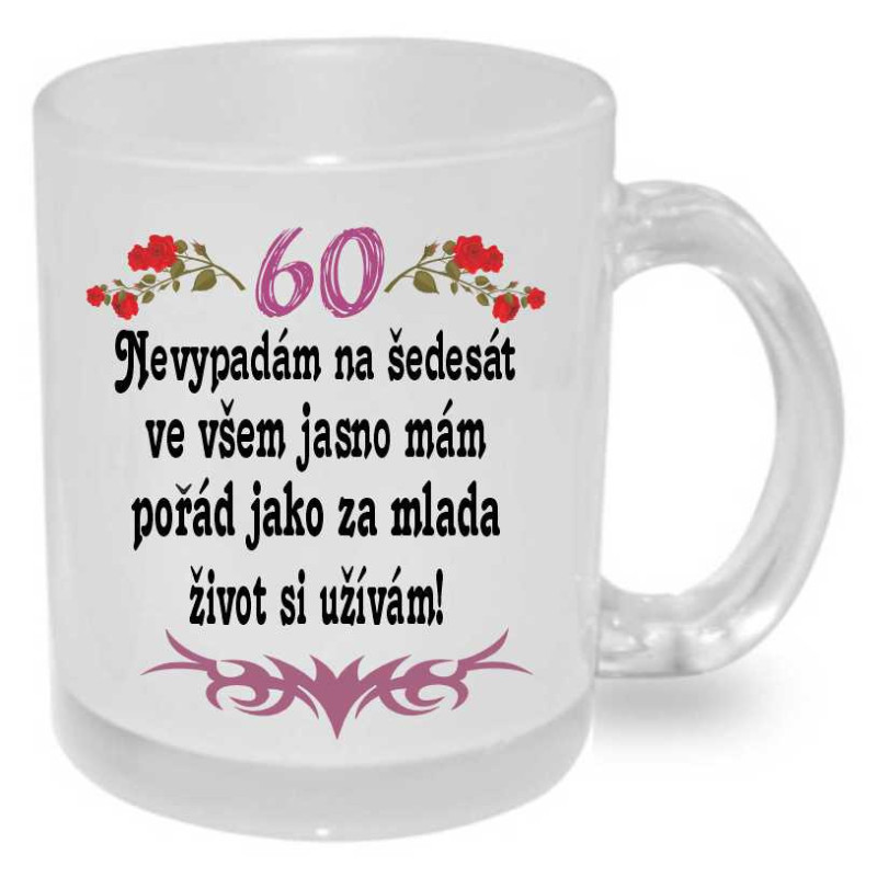 Hrnek s potiskem: Nevypadám na 60 ve všem jasno mám pořád jako za mlada si život užívám - je ideální dárek k 60. narozeninám pro ženu. Udělejte radost tímto krásným hrníčkem oslavenkyni 60 narozenin. Je to dárek praktický, který bude denně využíván na kávičku nebo čaj a zručeně udělá radost.