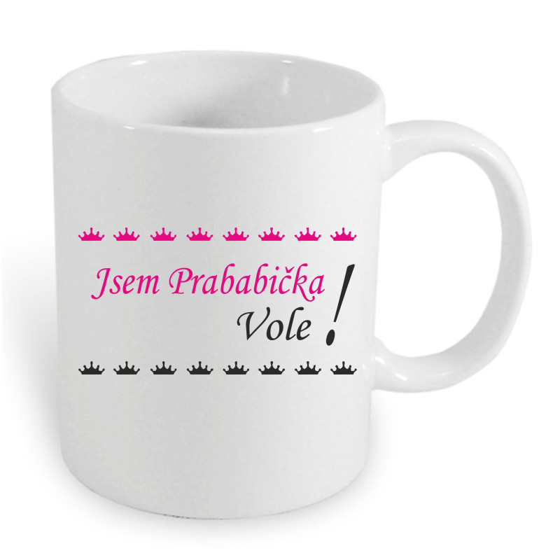 Nápis "Jsem Prababička, Vole!" je vytištěn výrazným písmem, které dodává hrnku jeho charakteristický vzhled a vtipný nádech.