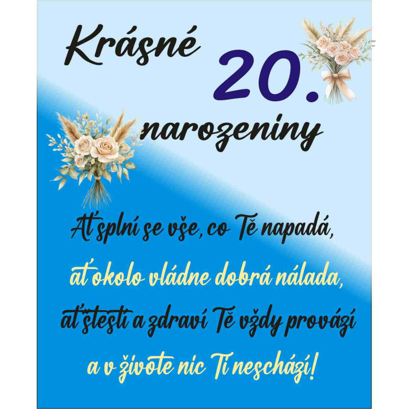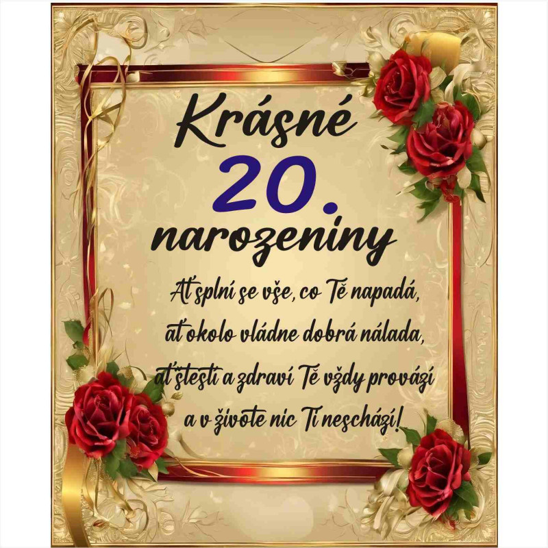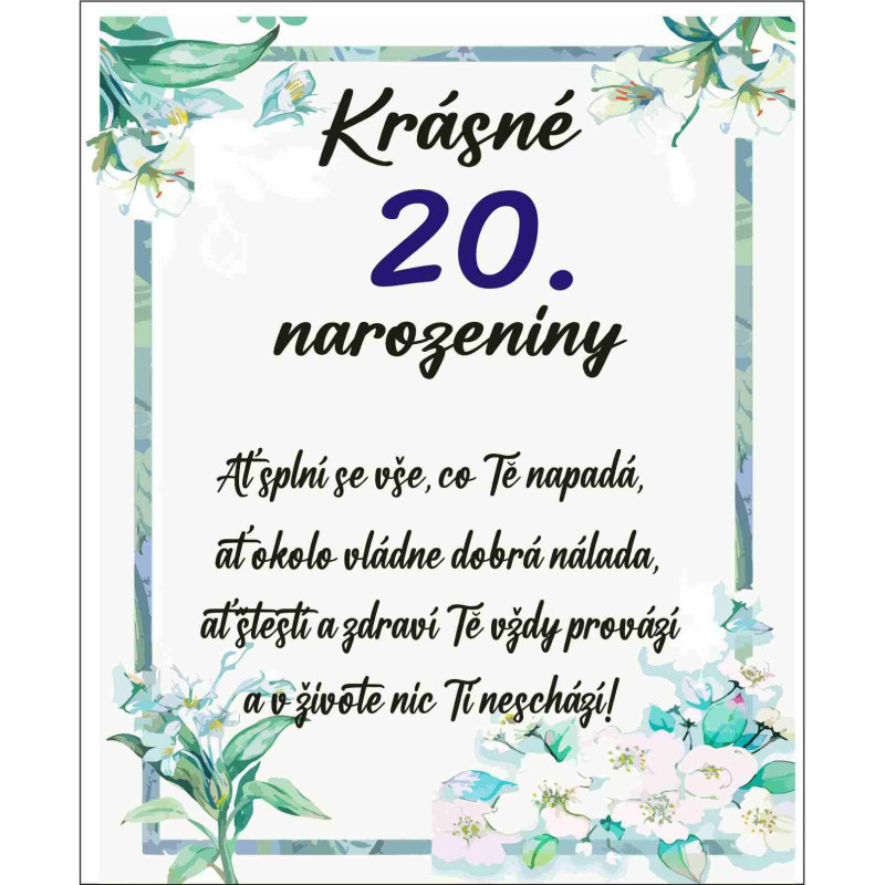 Oslavte magickou dvacítku s tímto nádherným papírovým přáním! Elegantní design s nápisem "Krásné narozeniny" a srdečný text uvnitř vykouzlí úsměv na tváři každého oslavence. Perfektní způsob, jak doplnit dárek a podtrhnout význam tohoto krásného životního jubilea. Buďte připraveni na oslavu dvacátých narozenin!