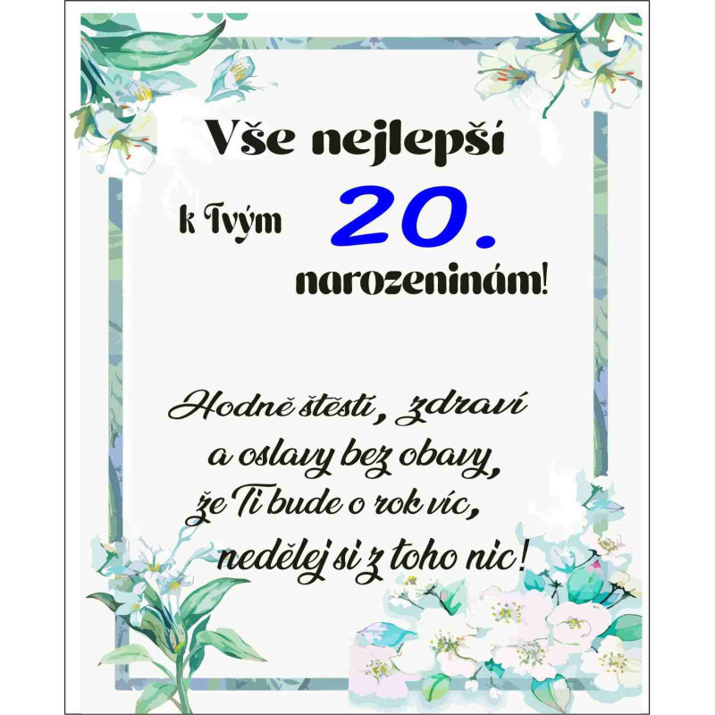 Popřejte oslavenci k jeho 20. narozeninám stylově s tímto krásným papírovým přáním! Elegantní design s nápisem „Hodně štěstí“ a prostor pro váš osobní vzkaz udělají radost každému. Perfektní dárek, který dodá narozeninám jedinečnou atmosféru. Buďte připraveni na oslavu, přání je skladem a čeká na rychlé odeslání.