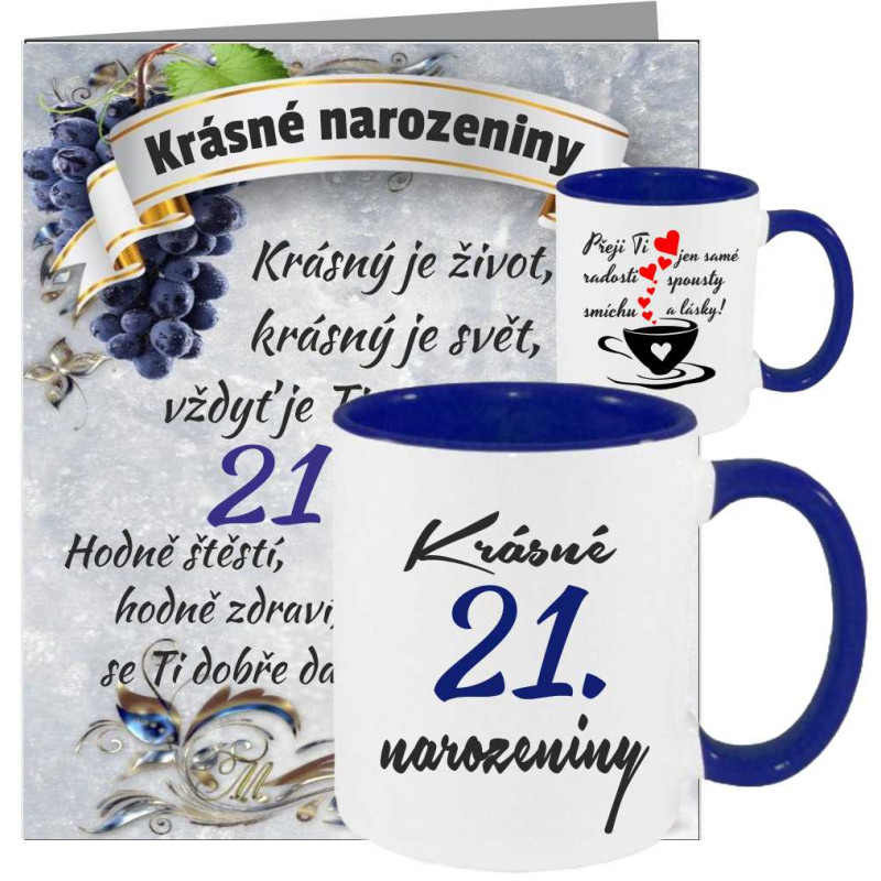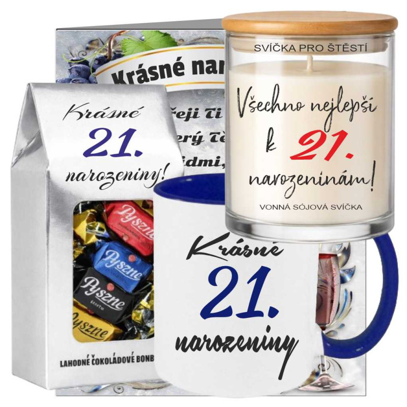 • Set s keramickým hrnkem s potiskem „Krásné 21. narozeniny“.