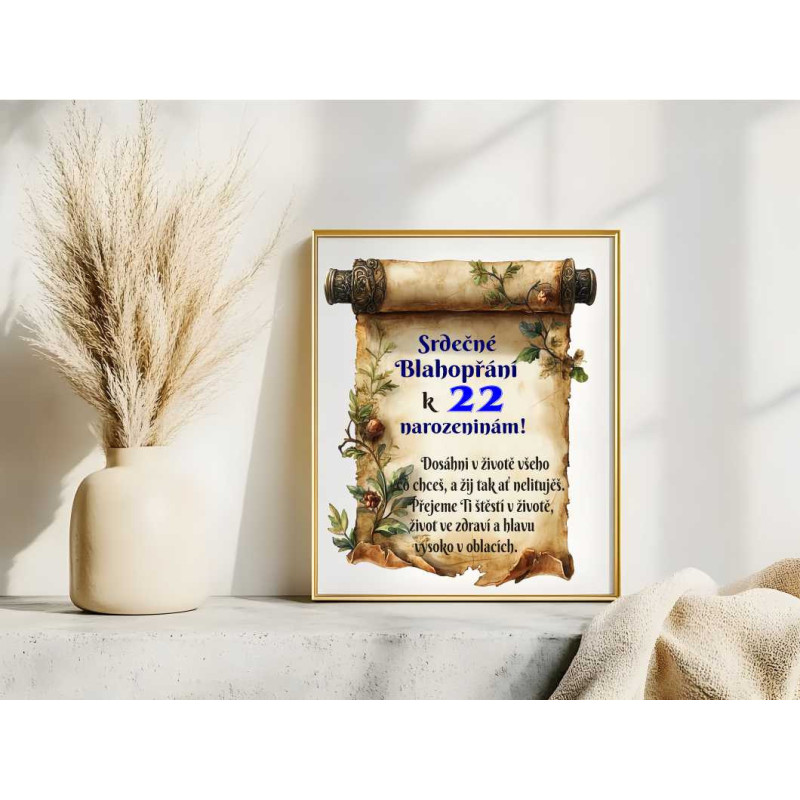 Blahopřání je vyrobeno z kvalitních materiálů a nabízí krásný motiv, který z něj činí nejen osobitý způsob, jak popřát, ale také vzpomínku, kterou si oslavenec může uchovat. Připojte toto přání k dárku a vytvořte úsměv na tváři každého, kdo slaví své 22. narozeniny!