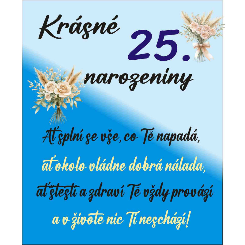 Oslavte čtvrtstoletí života s tímto elegantním papírovým přáním! Stylový design s nápisem "Krásné narozeniny" a vřelé poselství uvnitř přání udělají radost každému oslavenci. Ideální doplněk k dárku, který podtrhne význam tohoto krásného jubilea. Potěšte oslavence tímto nádherným přáním! Přání je skladem a připraveno k rychlému odeslání.