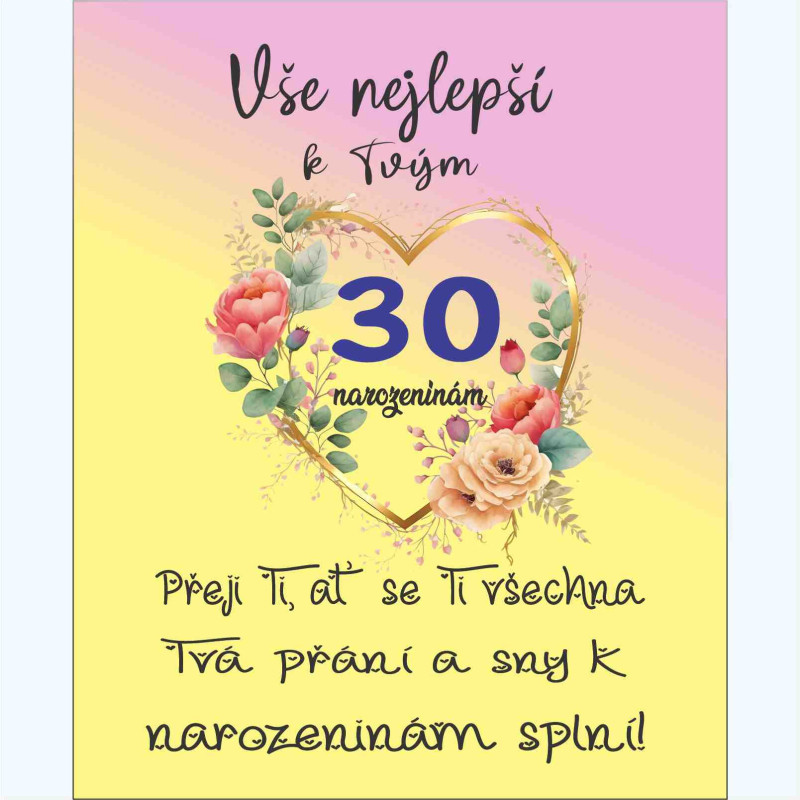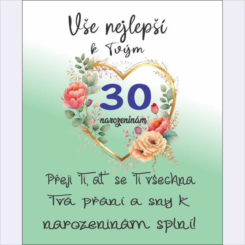 Oslavte vstup do třicítky s tímto stylovým papírovým přáním! Jedinečný design a srdečné poselství uvnitř přání dokonale doplní váš dárek a udělají radost každému oslavenci. Skvělý způsob, jak podtrhnout význam tohoto životního jubilea. Buďte připraveni na oslavu! Přání je skladem a k dispozici k okamžitému odeslání.