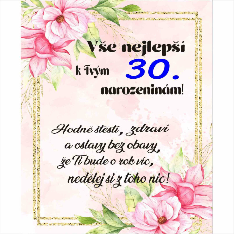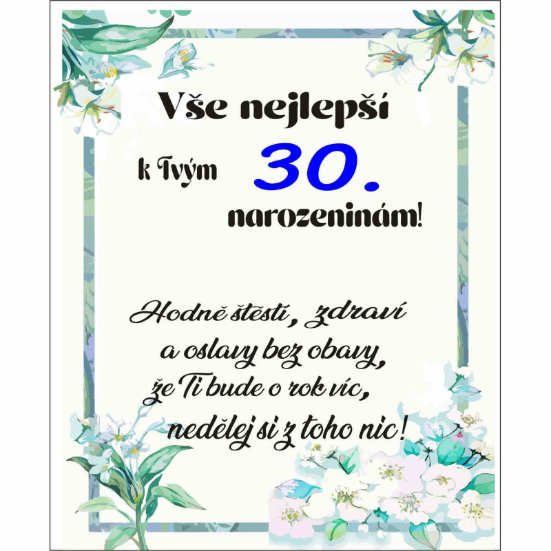 Popřejte oslavenci k jeho kulatým 30. narozeninám stylově s tímto elegantním papírovým přáním! Motiv „Hodně štěstí“ a dostatek místa pro váš osobní vzkaz z něj dělají dokonalý doplněk k dárku, který potěší a zahřeje u srdce. Připravte se na oslavu, přání je skladem a připraveno k odeslání!
