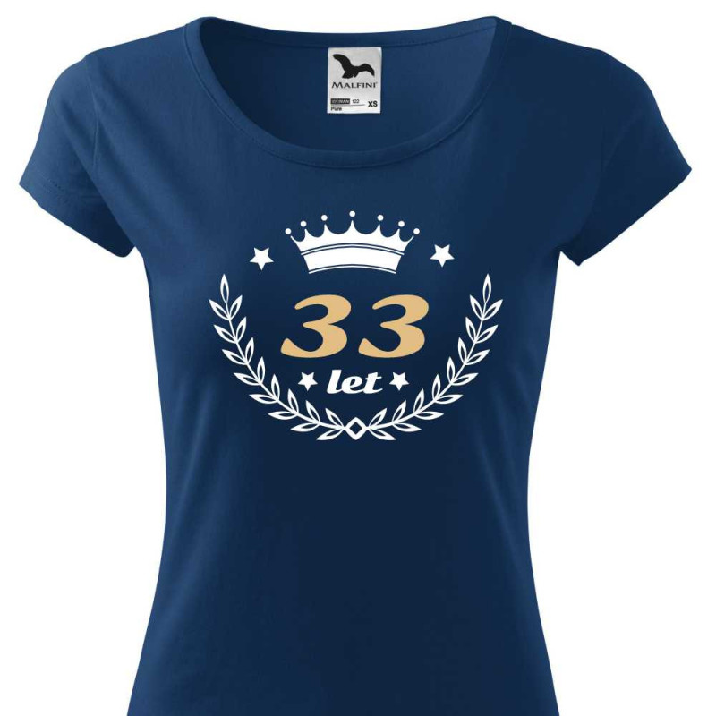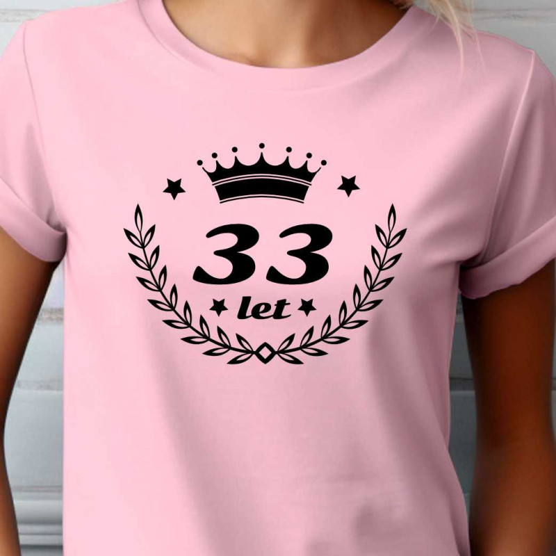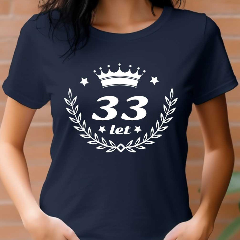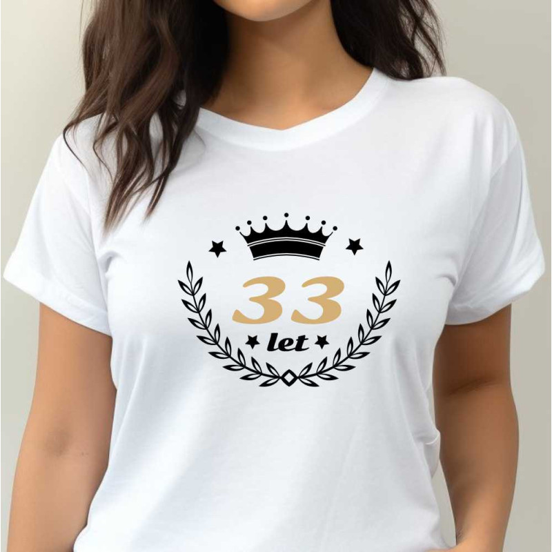 Dámské tričko s potiskem: 33 let. Skvělý dárek k 33 narozeninám pro ženu, která má ráda originalitu. Udělejte radost tričkem, které má v pěkném originálním emblému číslo 33 let.