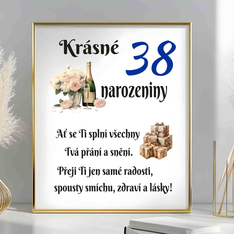 Oslavte 38. narozeniny s tímto elegantním přáním, které v sobě nese pozitivní energii, radost a srdečné poselství. Stylový design s jemnými detaily a harmonickými barvami dělá z tohoto přání ideální doplněk k narozeninovému dárku.
