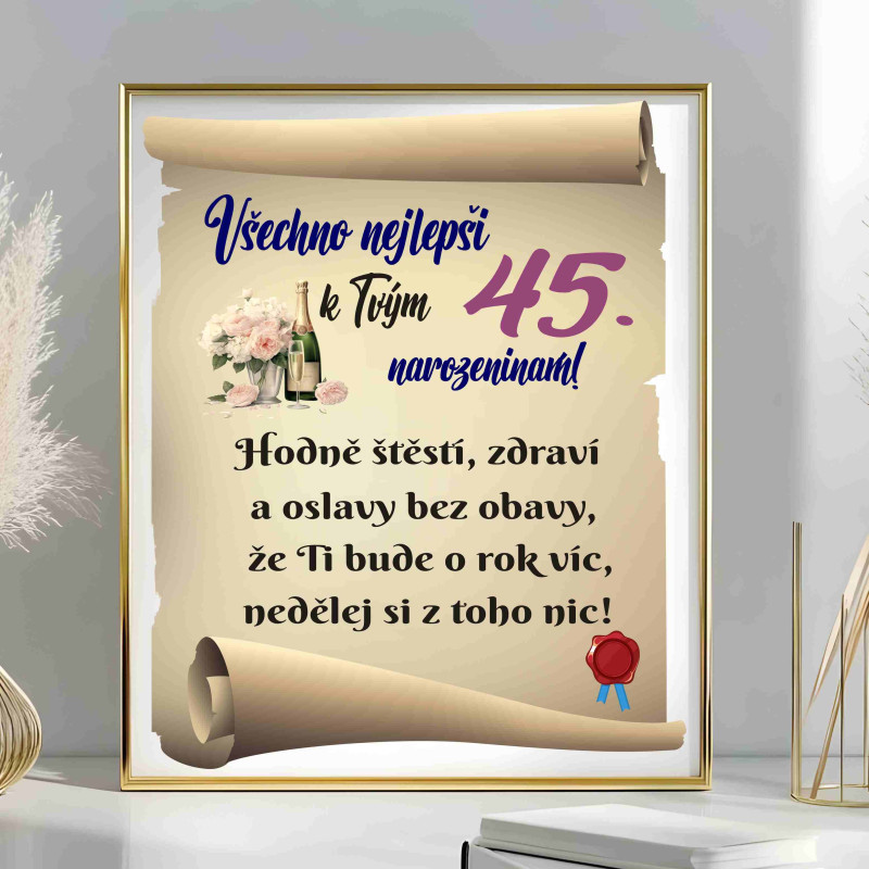 Oslavte 45. narozeniny s úsměvem a nadhledem! Toto vtipné přání s textem „Nedělej si z toho nic, že ti bude o rok víc“ je skvělým doplňkem k dárku, který oslavenci vykouzlí úsměv na tváři a připomene, že život je třeba brát s humorem.