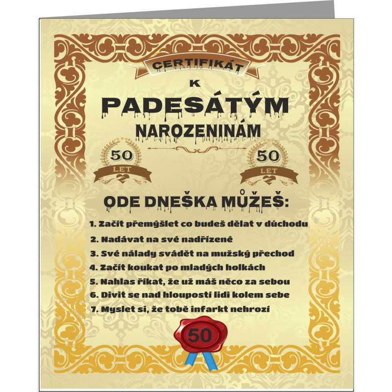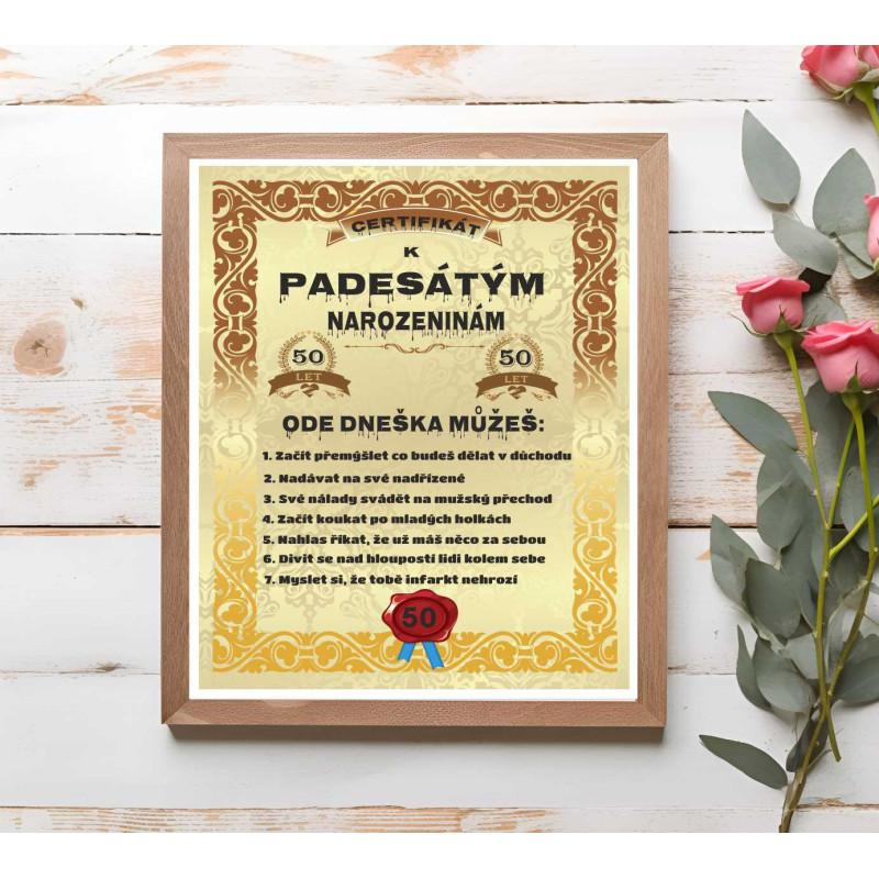 Hledáte originální dárek k padesátinám, který zaručeně pobaví? Tento vtipný certifikát je ideální volbou! Udělejte z oslavence oficiálního „padesátníka“ s nadhledem – protože 50 není žádný důvod k panice, ale k oslavě!