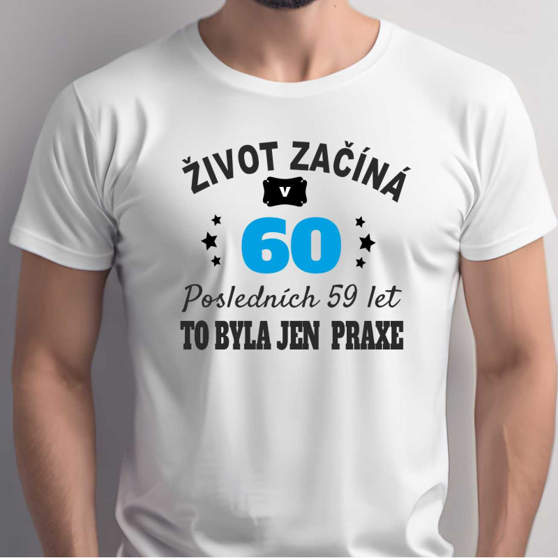Šedesátka? To není důvod zpomalit – to je teprve pořádný start! Originální pánské tričko s nápisem „Život začíná v 60, posledních 59 let to byla jen praxe“ je skvělým dárkem pro muže, který má smysl pro humor, životní nadhled a chuť si užívat každý den naplno.