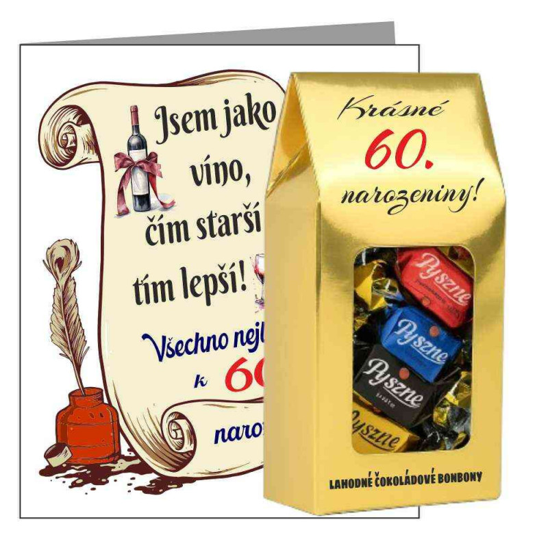Šedesátka není důvod ke smutku – naopak! S tímto vtipným přáním k 60. narozeninám s nápisem „Jsem jako víno, čím starší tím lepší“ vykouzlíte úsměv na tváři každého oslavence.