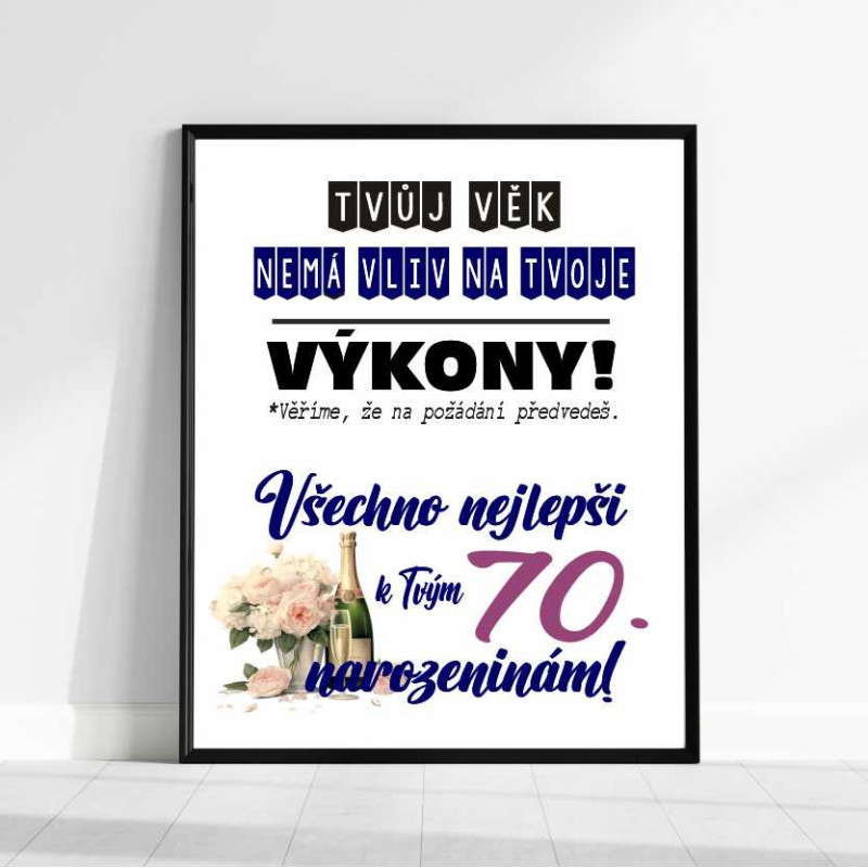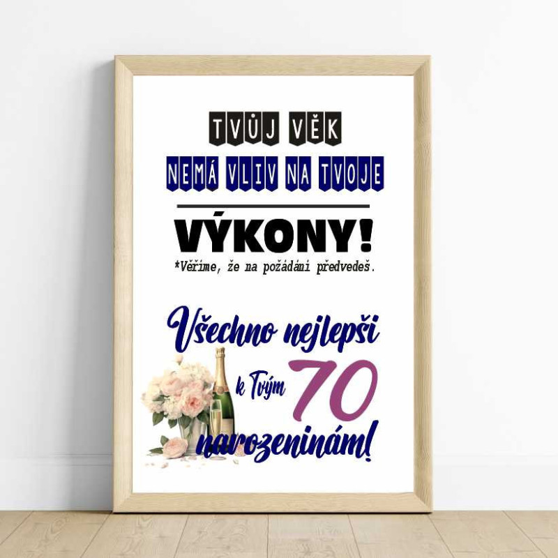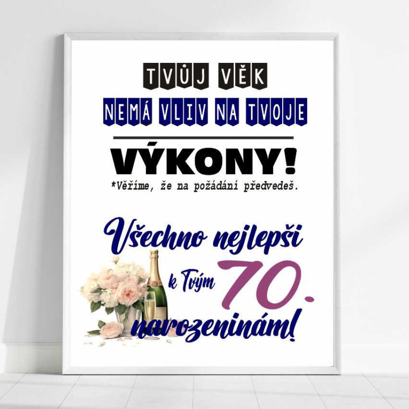 Oslavte úžasných 70 let stylově a s humorem! Toto přání s nápisem "Tvůj věk nemá vliv na tvoje výkony" je perfektní volbou, jak oslavenci připomenout, že i v tomto krásném věku si mohou užívat života naplno.