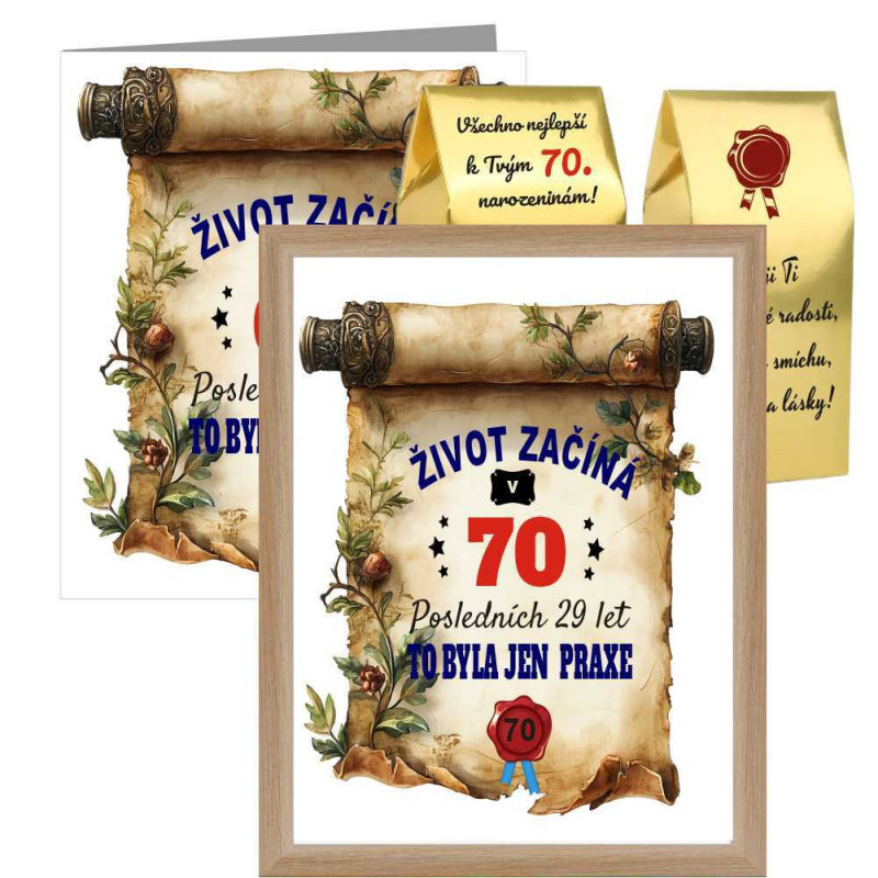 Oslavte 70. narozeniny s humorem! Toto vtipné přání s nápisem „Život začíná v 70 letech. Posledních 69 let to byla jen praxe“ je perfektním doplňkem k dárku pro muže i ženy.