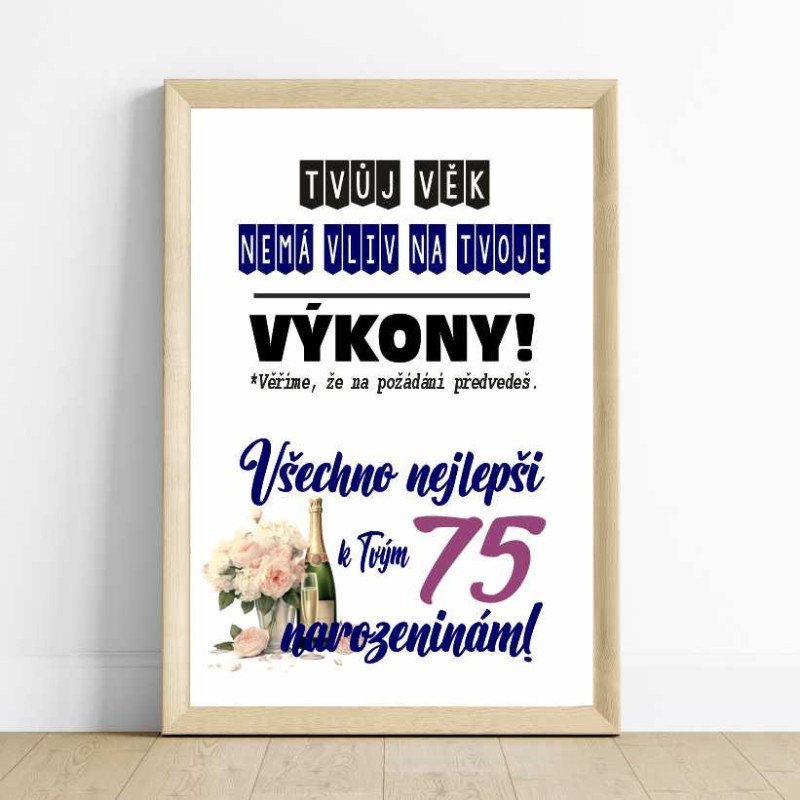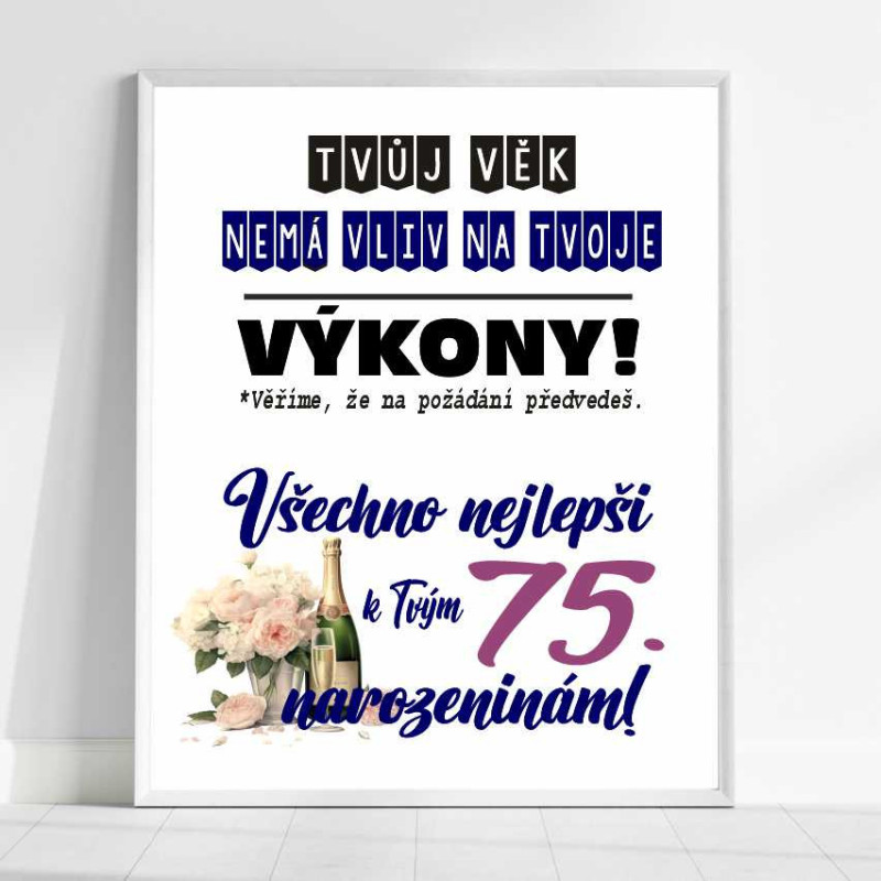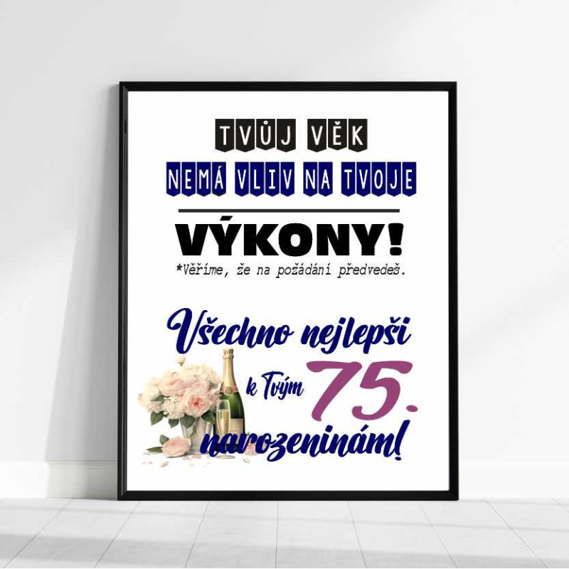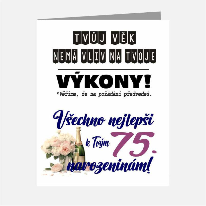 Oslavte významné 75. narozeniny s humorem a nadhledem! Toto přání s textem "Tvůj věk nemá vliv na tvoje výkony" je skvělou volbou, jak oslavenci ukázat, že energie a radost ze života nemají s věkem nic společného.