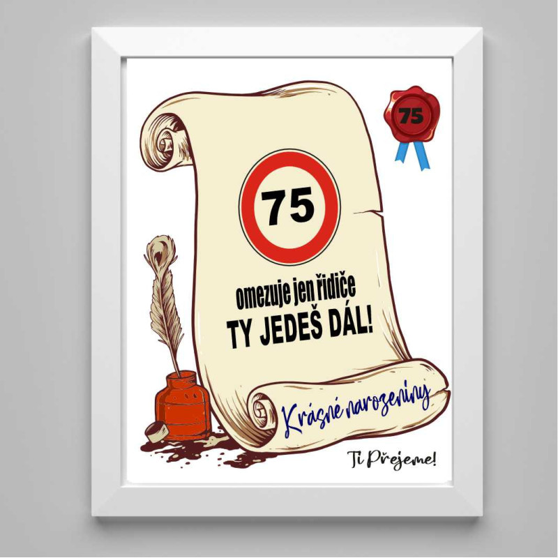 Překvapte oslavence vtipným přáním, které mu vykouzlí úsměv na tváři! Toto originální papírové přání k 75. narozeninám je ideální pro muže, kteří si i v tomto věku drží elán a nadhled. Text „75 omezuje jen řidiče, ty jedeš dál!“ říká vše – věk je jen číslo a život jede dál naplno!