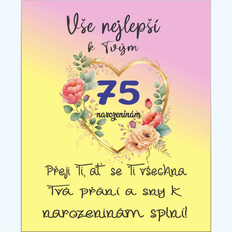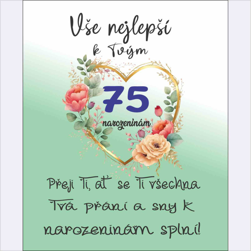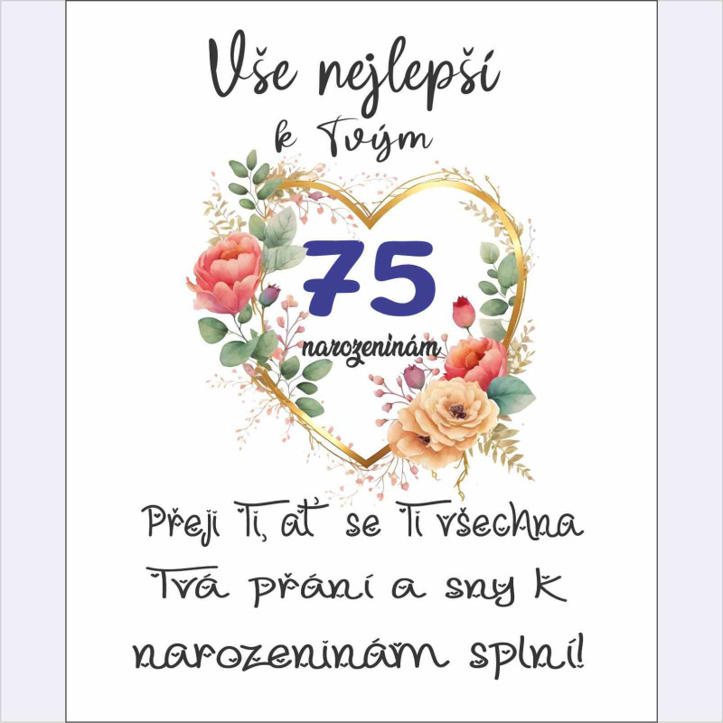 Oslavte jedinečný životní milník s tímto krásným papírovým přáním k 75. narozeninám! Stylový design a srdečný text udělají každému oslavenci radost a zanechají nezapomenutelný dojem. Perfektní doplněk k dárku, který podtrhne význam tohoto výjimečného dne. Buďte na oslavu připraveni! Přání je skladem a k dispozici ihned.