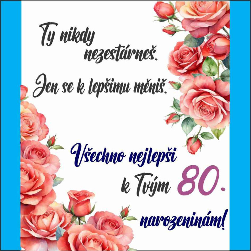 Oslava 80. narozenin je mimořádná událost, která si zaslouží výjimečné přání! S textem "Ty nikdy nezestárneš" darujete nejen úsměv, ale i poselství, že věk je jen číslo a elán zůstává navždy.