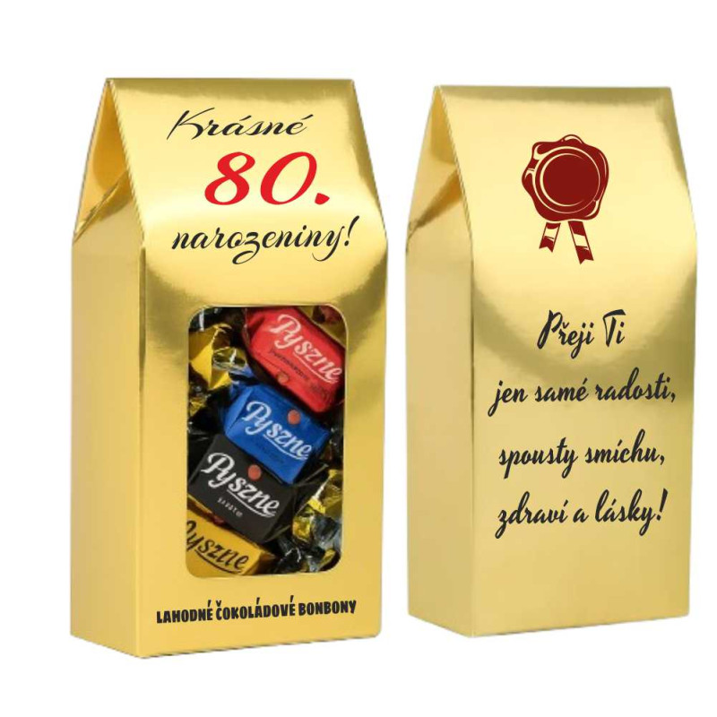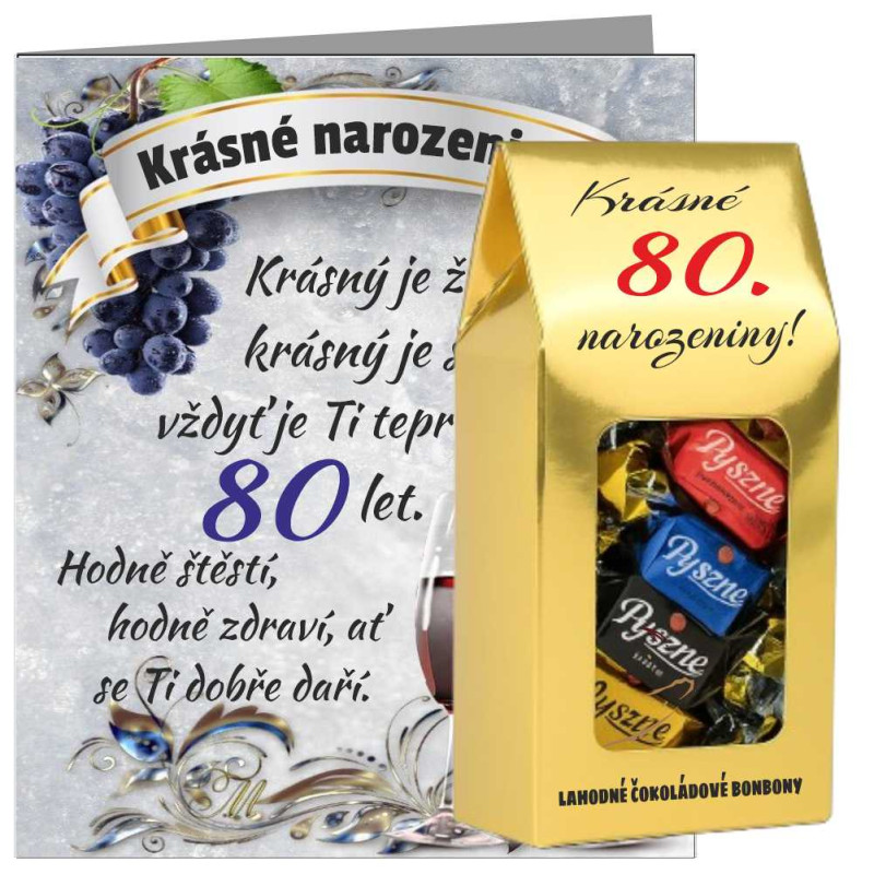 Dárkové přání s čokoládovými bonbony: Propojte milá slova se sladkým potěšením! Tato varianta obsahuje výběr luxusních čokoládových pralinek v dárkovém balení. Je to ideální volba pro jubilanty, kteří si rádi zpříjemní slavnostní chvíle kouskem kvalitní čokolády.