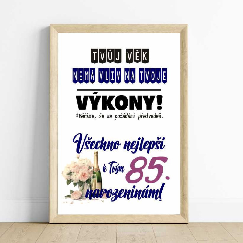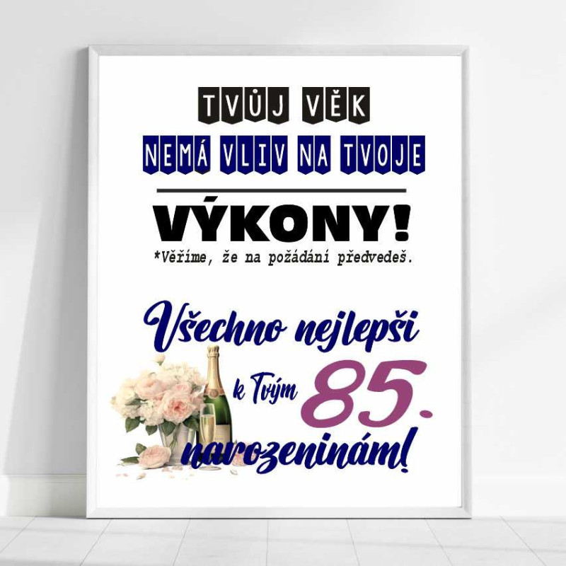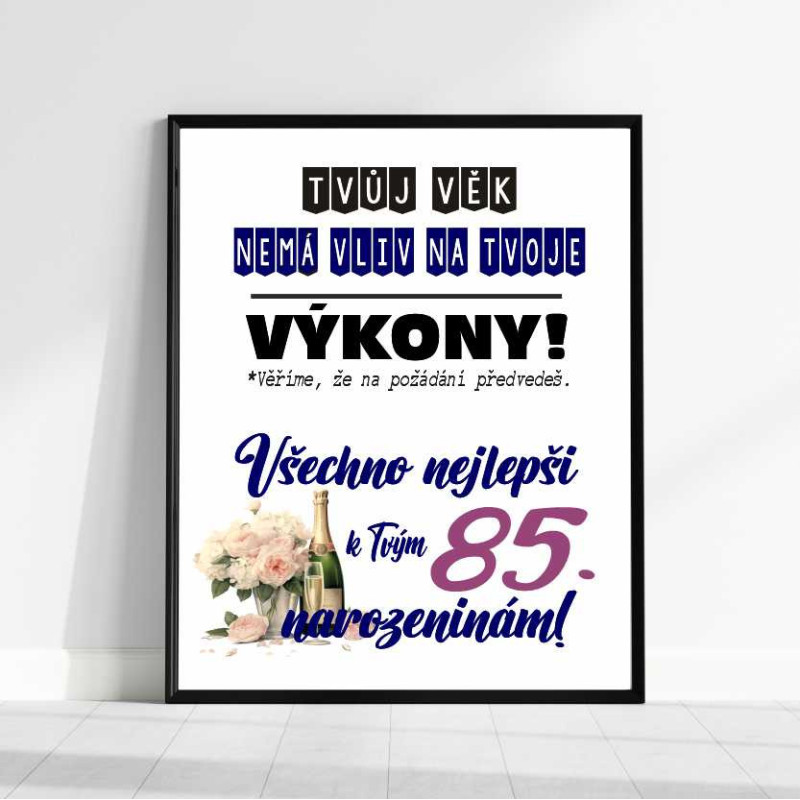 Oslavte úžasných 85 let stylově a s nadhledem! Toto papírové přání s textem "Tvůj věk nemá vliv na tvoje výkony" je skvělým způsobem, jak oslavenci ukázat, že energie a radost ze života nemají s věkem nic společného.