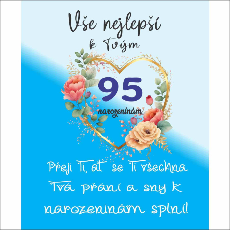 Oslavte neuvěřitelných 95 let života s tímto elegantním papírovým přáním! Jedinečný design a srdečný text uvnitř přání dodají vašemu blahopřání zvláštní kouzlo. Ideální způsob, jak vyjádřit svou úctu a radost k tomuto jedinečnému jubileu. Udělejte radost oslavenci! Přání je skladem a připraveno k okamžitému odeslání.