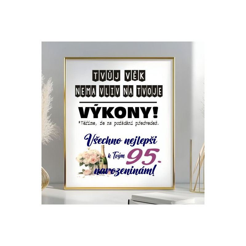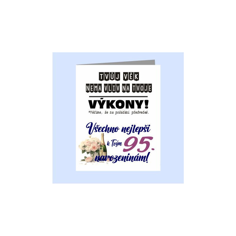 Oslavte neuvěřitelných 95 let stylově a s humorem! Toto papírové přání s textem "Tvůj věk nemá vliv na tvoje výkony" je perfektním způsobem, jak oslavenci ukázat, že radost ze života a energie nemají věkové hranice.