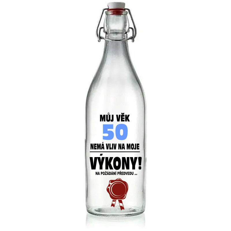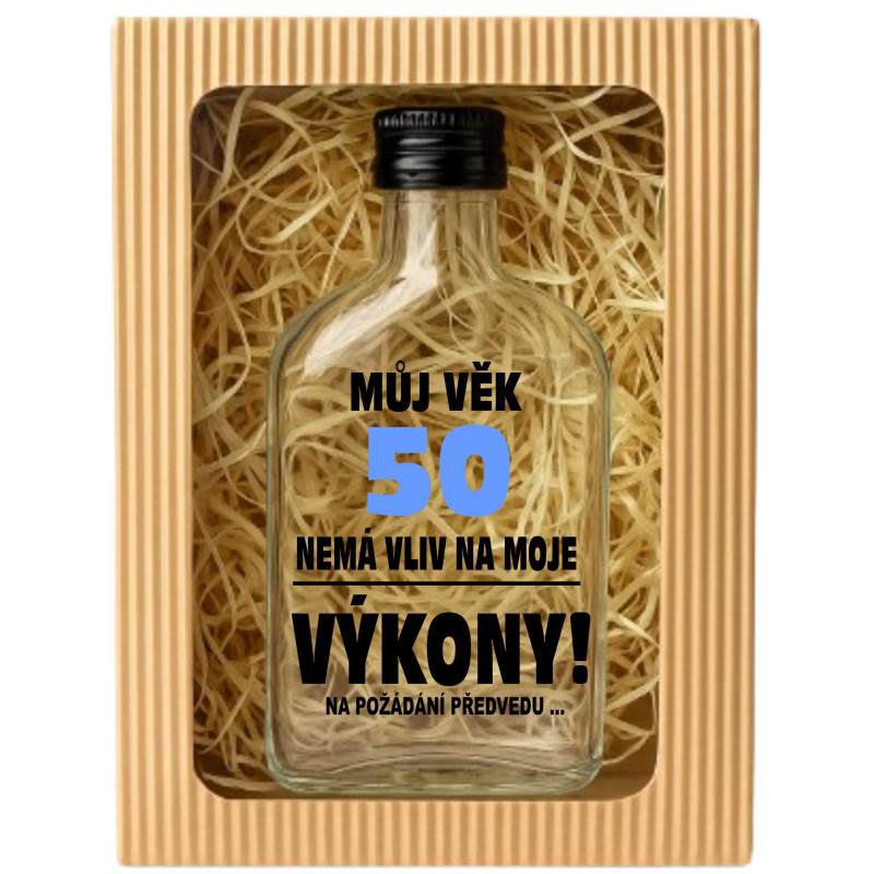 Originální, vtipná a trefná placatka pro muže, který si i v padesáti zachovává elán, energii a smysl pro humor! Skleněná láhev s potiskem „Můj věk 50 nemá vliv na moje výkony!“ je skvělým dárkem k 50. narozeninám pro každého chlapa, který se nenechá číslem zaskočit.