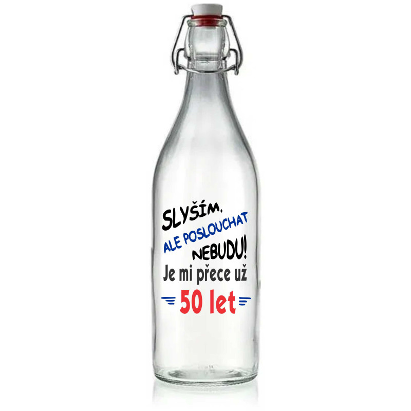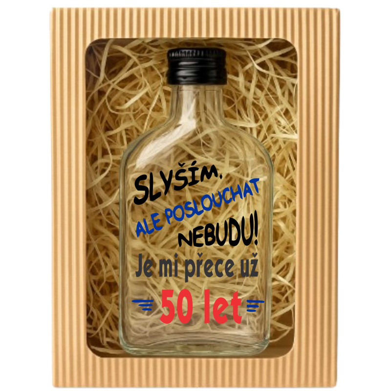 Vtipná placatka k 50. narozeninám s originálním potiskem „Slyším, ale poslouchat nebudu – je mi přece už 50 let“ potěší každého muže. Skleněná láhev o objemu 0,2 litru s plechovou zátkou je ideálním dárkem pro tátu, dědu, kolegu nebo kamaráda k padesátinám.