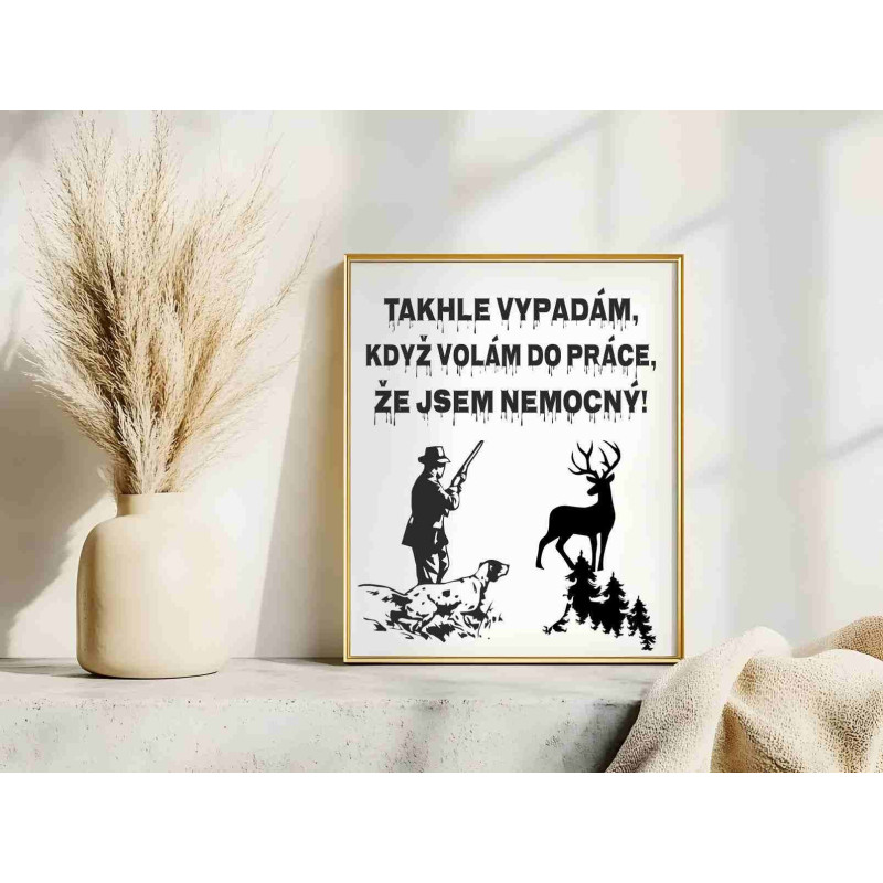 Humorný obraz s nápisem „Takhle vypadám, když volám do práce, že jsem nemocný, jsem na lovu“ je perfektním dárkem pro každého muže, který miluje lov a nebojí se zasmát své vášni. Skvělý doplněk pro každého myslivce, který ví, že nejlepší lék je čas strávený v přírodě.