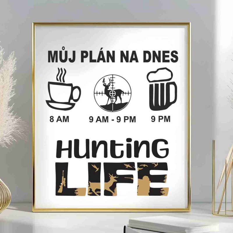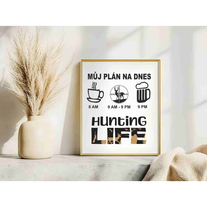 Tento originální obraz s nápisem „Můj plán na dnes: Pivo, káva a lov“ vystihuje dokonalý den každého myslivce a milovníka lovu. Je to skvělý dárek pro muže, kteří si umí vychutnat jednoduché radosti života – chvíle v přírodě, dobré pivo a silnou kávu.