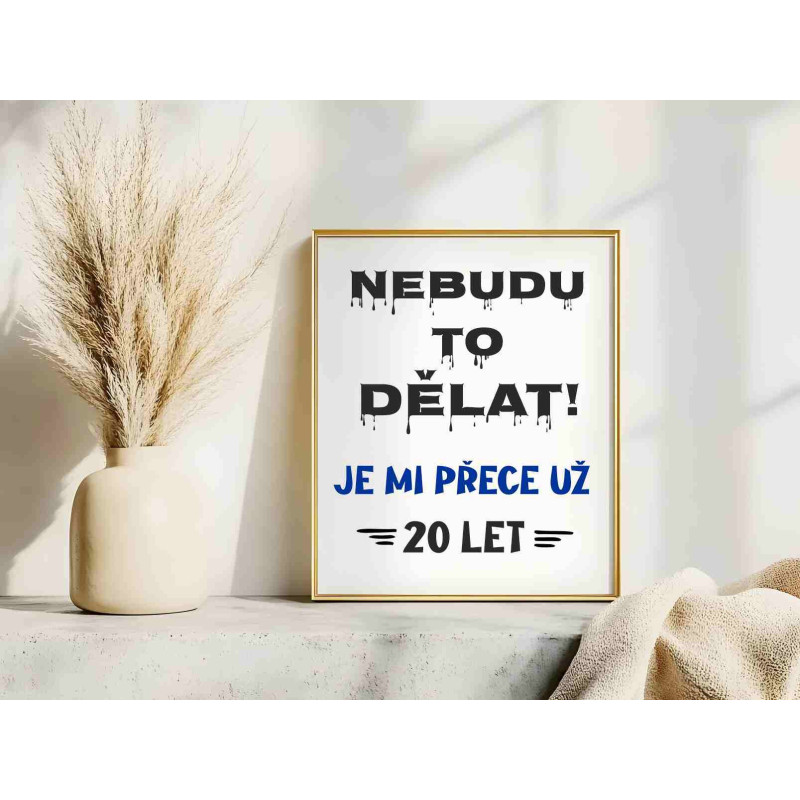 Vtipný obraz s nápisem „Nebudu to už dělat, je mi přece 20 let“ je skvělým dárkem pro každého, kdo právě slaví vstup do druhé dekády svého života. S humorným podtónem a moderním designem přinese úsměv na tvář a skvěle se hodí jako památka na tento významný den.