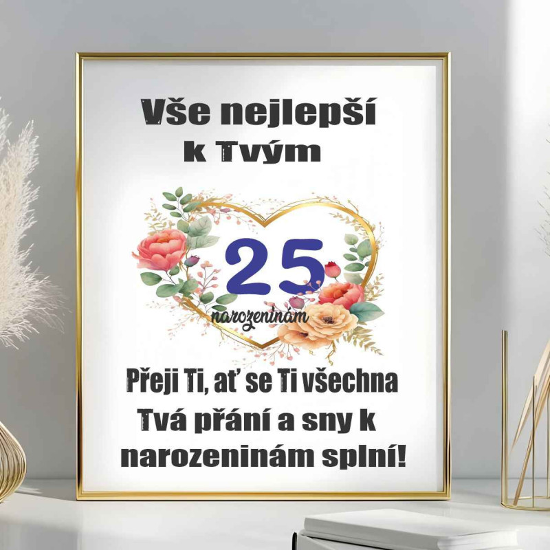Fotoobraz „Upřímné přání k 25. narozeninám“ je vtipným a originálním dárkem, který zaručeně potěší každého oslavence. Humorný design přání dodá oslavě lehkost a vytvoří nezapomenutelnou atmosféru. Tento stylový fotoobraz se skvěle hodí jako dekorace do bytu, která bude připomínat výjimečný den.