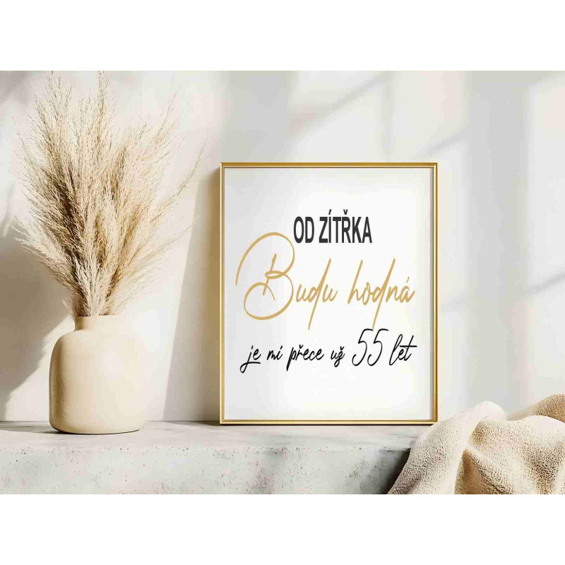 Oslavte 55. narozeniny s humorem a stylem! Tento originální obraz s textem „Od zítřka budu hodná, je mi přece už 55 let“ je perfektní dárek, který zaručeně vykouzlí úsměv na tváři každé oslavenkyně. Skvělý doplněk na oslavu a zároveň jedinečná vzpomínka na výjimečný den.
