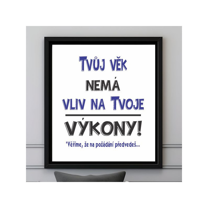 Hledáte originální a vtipný dárek k 85. narozeninám? Tento stylový obraz s humorným nápisem „Tvůj věk nemá vliv na tvoje výkony“ je skvělou volbou pro každého oslavence, který si stále udržuje elán, energii a smysl pro humor! Perfektní dekorace do obýváku, pracovny nebo dílny, která bude denně připomínat, že věk je jen číslo.